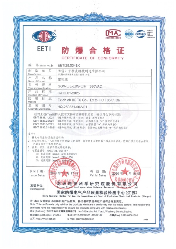 Le déanaí, d'éirigh le croí-tháirge Wuxi Huiqian Logistics Machinery Manufacturing Co., Ltd - an iompróir sorcóir - tástáil dhian agus fuair sé an deimhniú pléascadh-cruthúnas EETI go hoifigiúil! Léiríonn an deimhniú seo go gcomhlíonann feidhmíocht pléascadh-phromhadh an iompair sorcóir Huiqian caighdeáin sábháilteachta a aithnítear go hidirnáisiúnta, ag soláthar réiteach láimhseála ábhar níos iontaofa do thionscail ard-riosca ar nós peitriceimiceach, mianadóireacht ghuail, cógaisíochta agus tionscail mhíleata, agus a léiríonn cumais theicniúla láidre na cuideachta i réimse an trealaimh lóistíochta pléascadh.