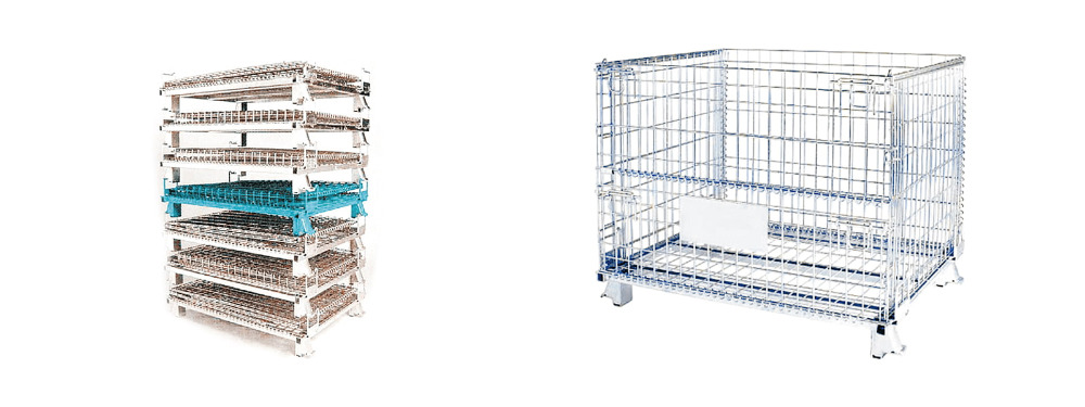 Is aonad stórála miotail é bosca pailléid mogalra sreinge - ar a dtugtar coimeádán sreinge, cage mogalra, nó bosca bruscair cruach infhillte - déanta as painéil mhogalra sreinge cruach táthaithe atá ceangailte le bunfhráma athneartaithe, a dearadh go minic le bheith ag luí le forklifts agus seaicéid phailléid.