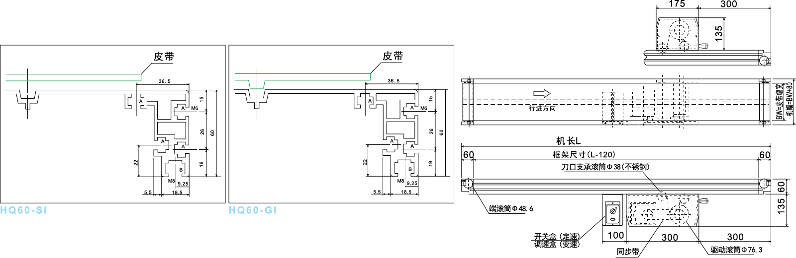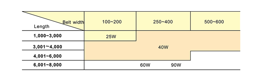 Tá an ghné iarbhír den chrios laghdaithe 5mm ná an crios caighdeánach thuas; Má sháraíonn fad an mheaisín 4m, le sonraíochtaí Creasa 500, 600 ar leithead, laghdófar é 10mm.
